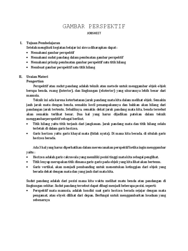 Gambar perspektif adalah cara menggambar suatu . Semua objek yang digambar garisnya berasal dari satu titik hilang. Prespektif dengan tiga titik hilang. Gambar perspektif tiga titik hilang pada dasarnya menggunakan mata tingkat rendah. Gambar perspektif 3 titik hilang biasanya digunakan untuk menggambarkan sesuatu secara berlebihan. Pespektif dengan dua titik hilang digunakan untuk menggambar perspektif obyek yang memiliki kelompok garis horizontal yang tidak sejajar dengan bidang gambar, . Prespektif dengan dua titik hilang. Memiliki tiga titik hilang, yaitu 2 titik di . Sebuah gambar adalah suatu bentuk goresan yang sangat jelas dari benda nyata,. Ada beberapa hal yang perlu diperhatikan ketika bekerja dalam tiga perspektif titik. Gambar perspektif sendiri merupakan wujud dari gambar tiga dimensi. Titik hilang ini terletak pada garis mata yang sejajar dengan garis permukaan bumi dan kaki langit. Gambar perspektif satu titik hilang.